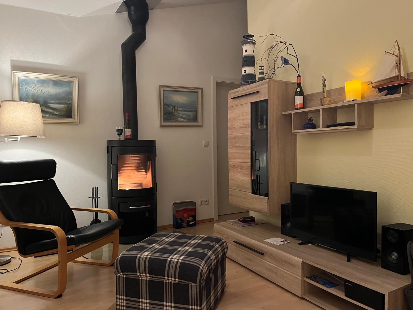 | Wohnzimmer: | gemütliche 3-Sitzer-Schlafcouch Textil 140x200 cm, TV-Flachbild, Wohnwand, Tisch, CD-Radio, MP3, Leselampe, Kamin |