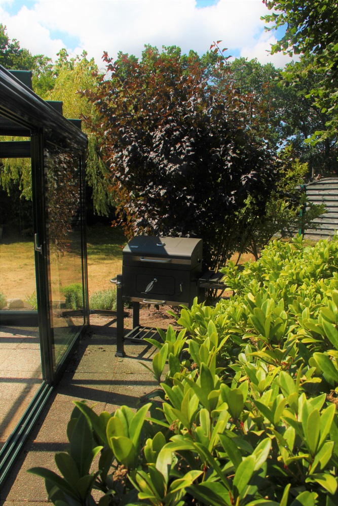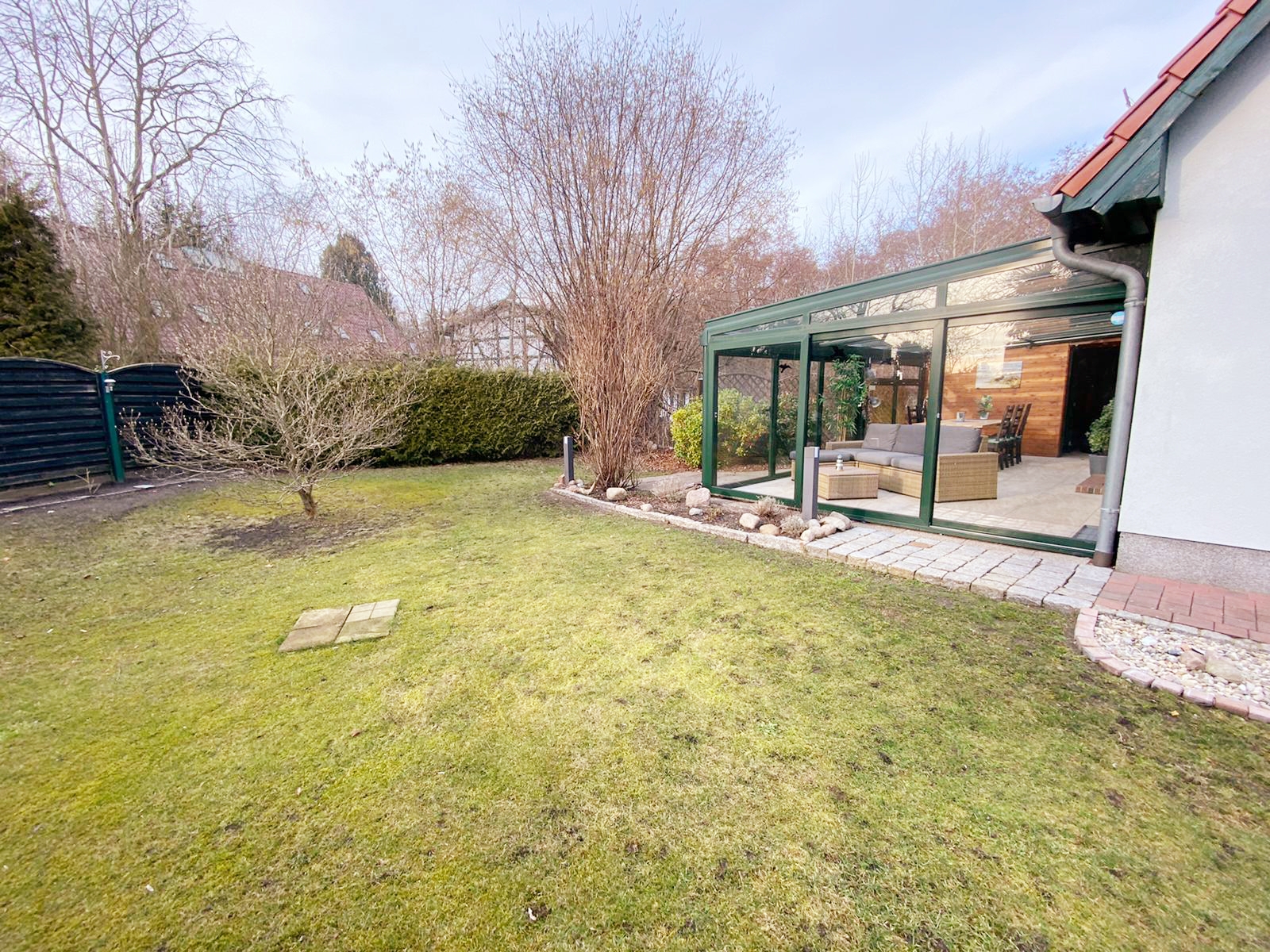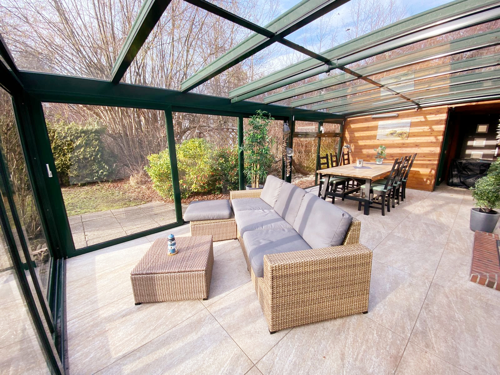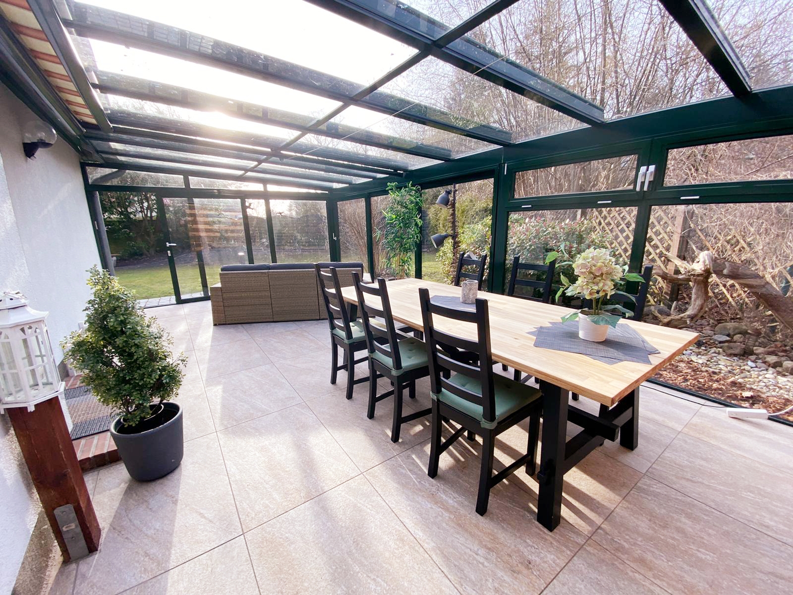 | Sommergarten: | 26m³ überdachter Glasanbau mit großem Esstisch und gemütlicher Sitzecke |