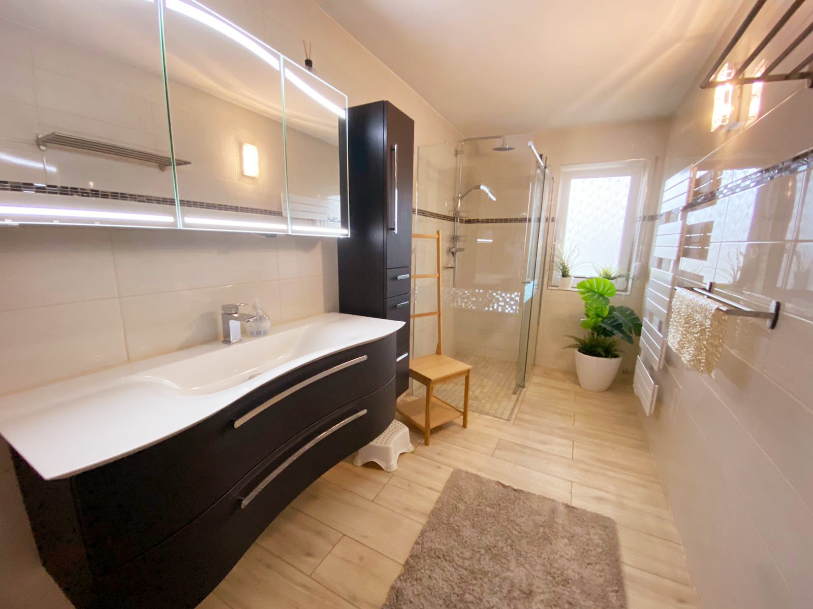 | Bad: | mit Fenster, Dusche, Toilette, Waschbecken mit Unterschrank, Schrank, Spiegelschrank, Handtuchheizung, Stuhl, Tritthocker, Handtuchhalter, Fön |