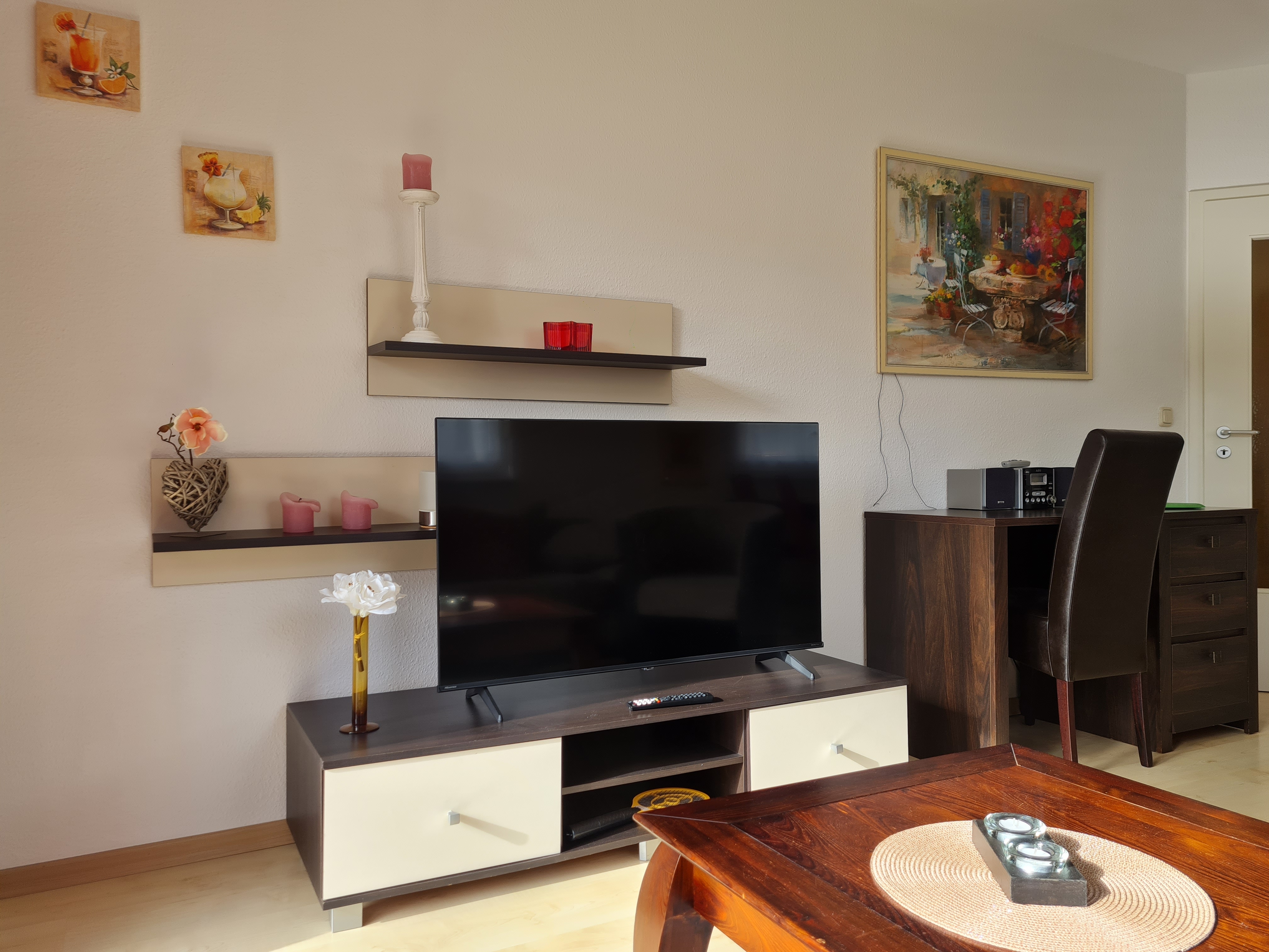 | Wohnzimmer: | gemütliche Schlafcouch 150x200 m, Sessel, TV, Flachstrecke Wohnwand, Radio mit CD, Schreibtisch |
