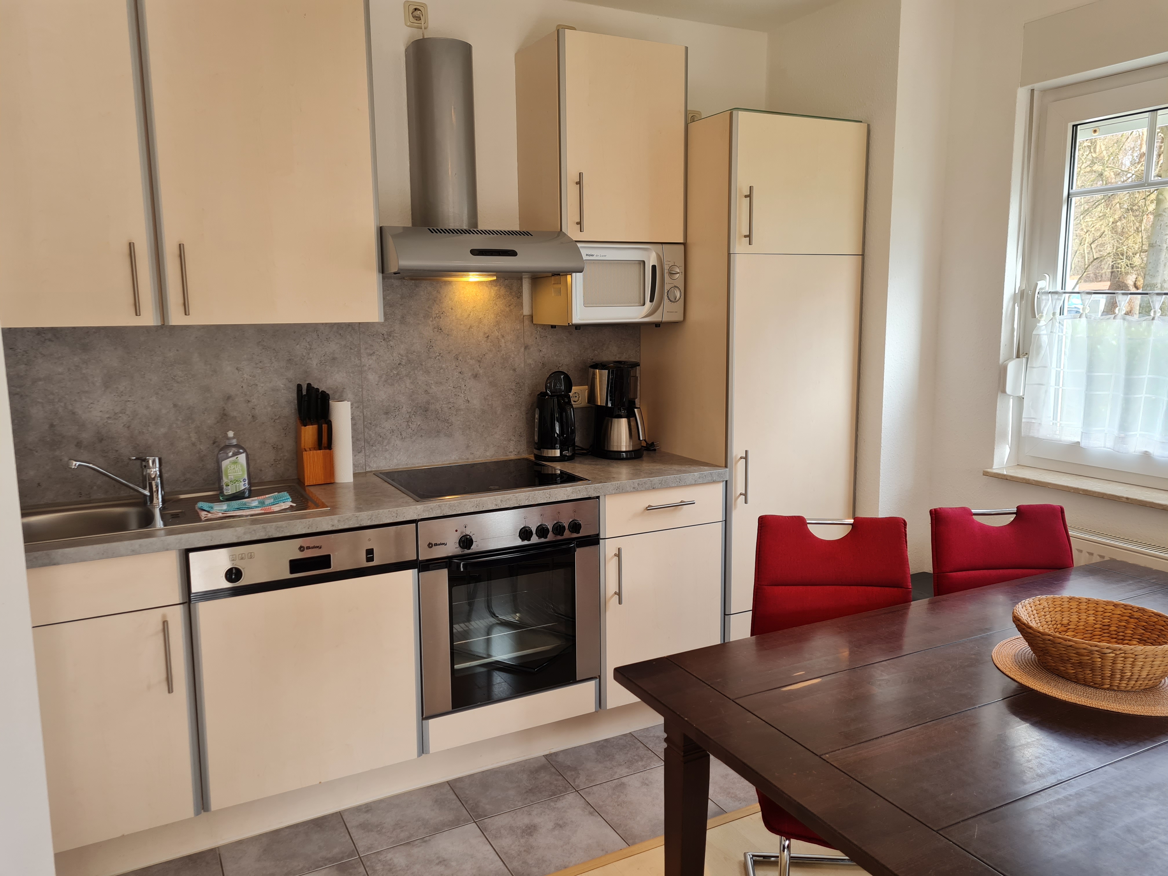 | Küche: | offen Wohnküche mit komplettem Zubehör und Essbereich für 4 Personen, Cerankochfeld, Backofen, Geschirrspüler, Mikrowelle, Kühlkombination |