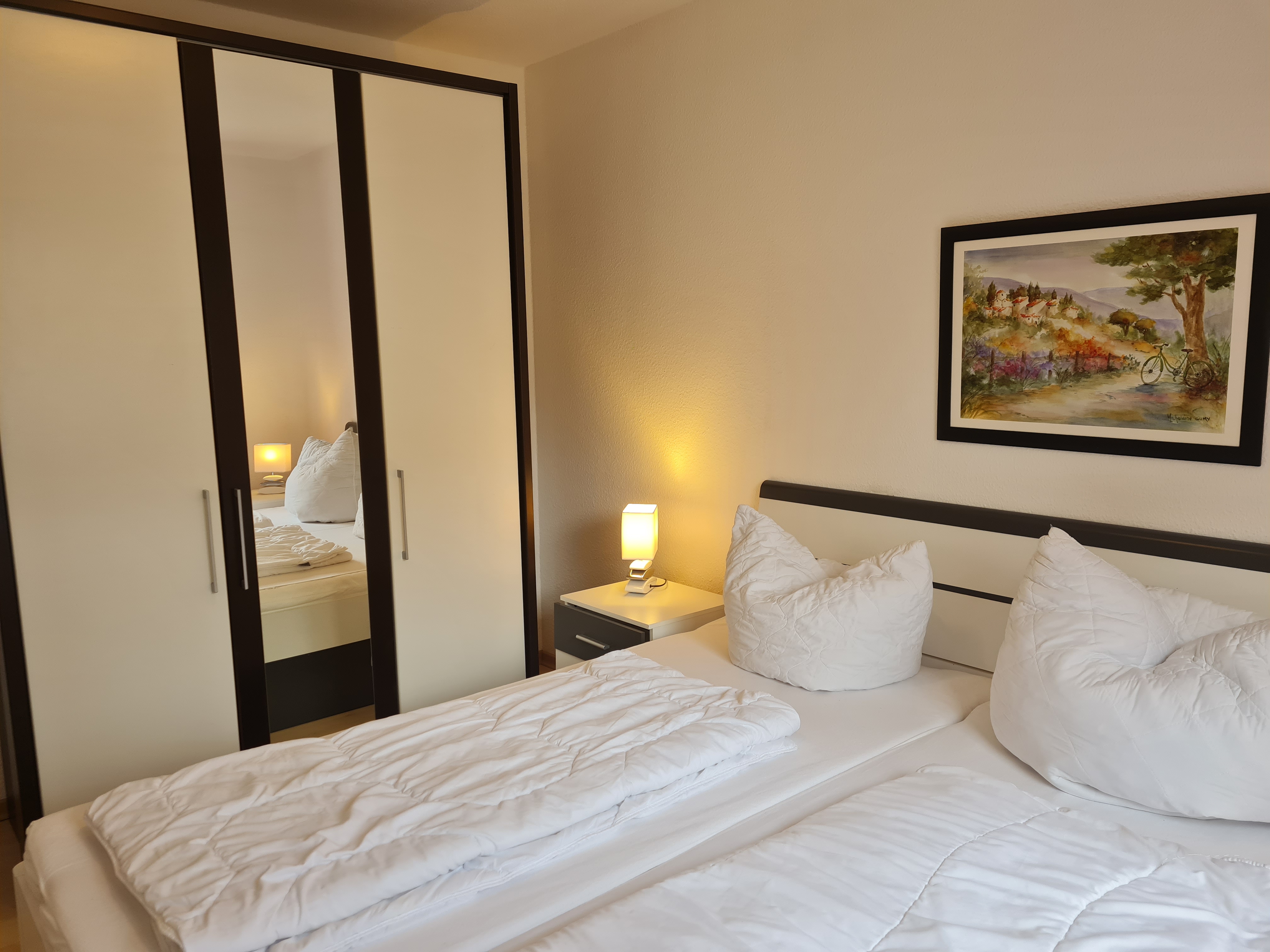 | Schlafzimmer: | Doppelbett mit zwei Einzelmatratzen 90x200 m, Kommode, 4-türiger Schrank |
