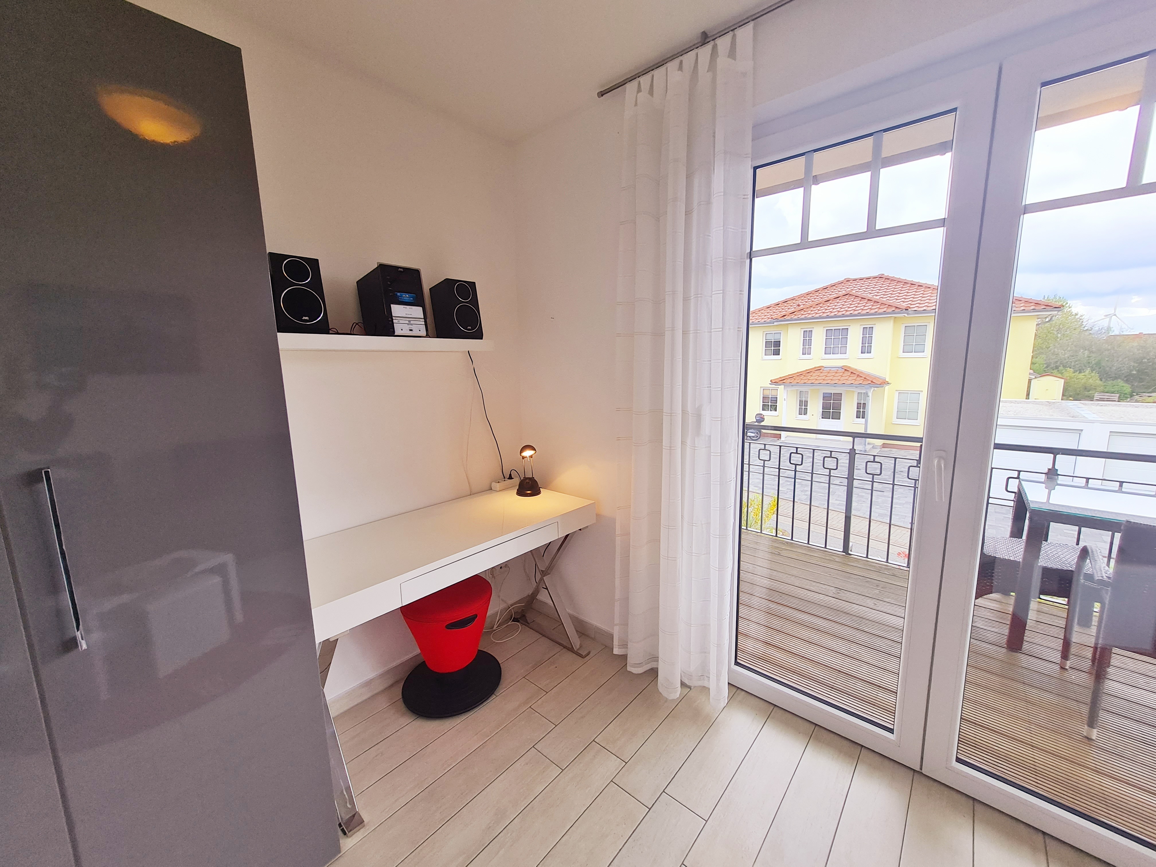 | Schlafzimmer II: | Schlafcouch 100x200 m, Gästebett kann man unten rausrollen mit 90x200 m, Schrank, Schreibtisch + Hocker, Lampe, kleiner Tisch, Hifi-Anlage, direkter Zugang zum Balkon |