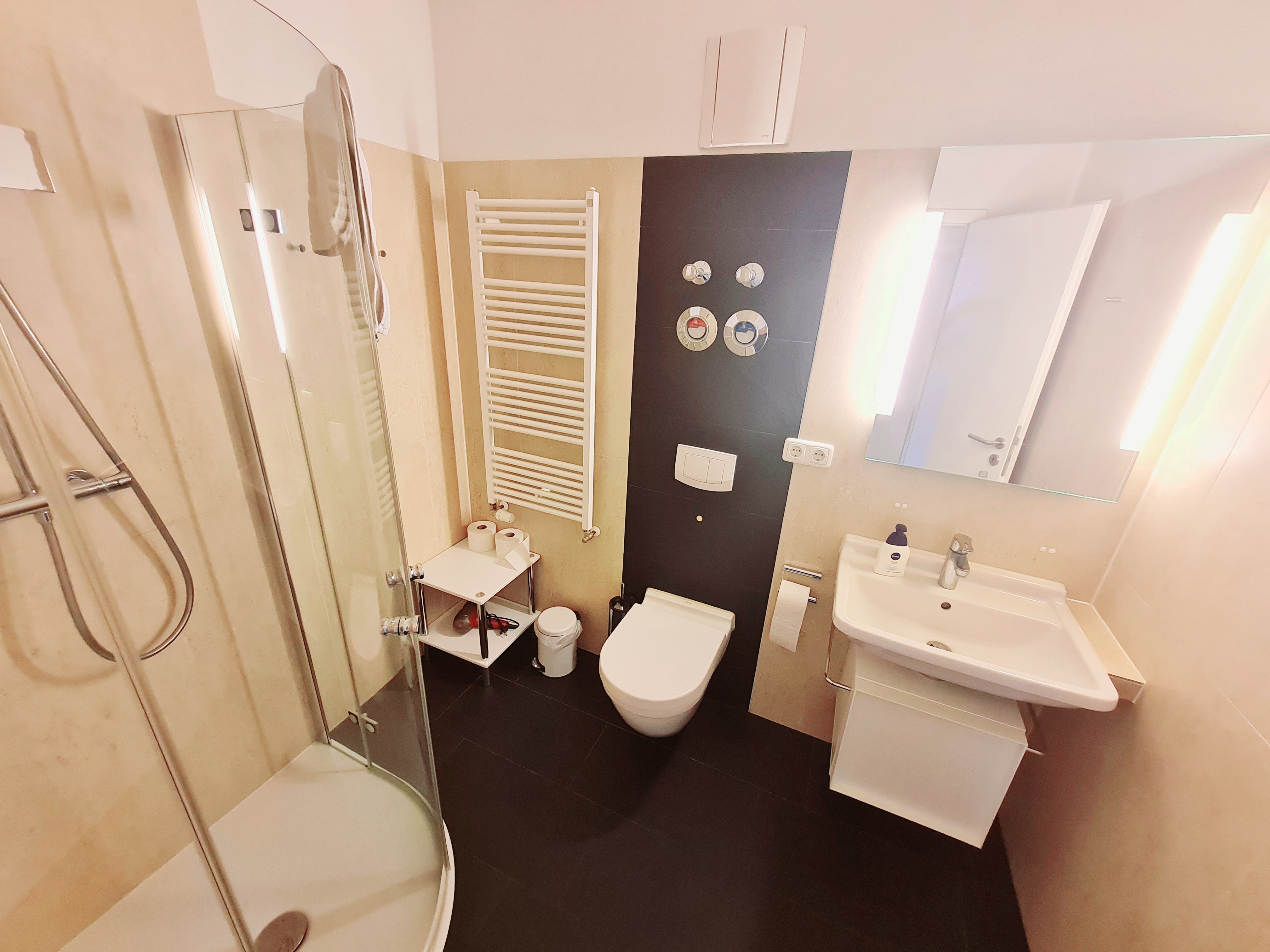 | Bad: | Dusche, Waschbecken, Toilette, Spiegel, Fön, Waschbeckenunterschrank, Handtuchheizköper, Regal |