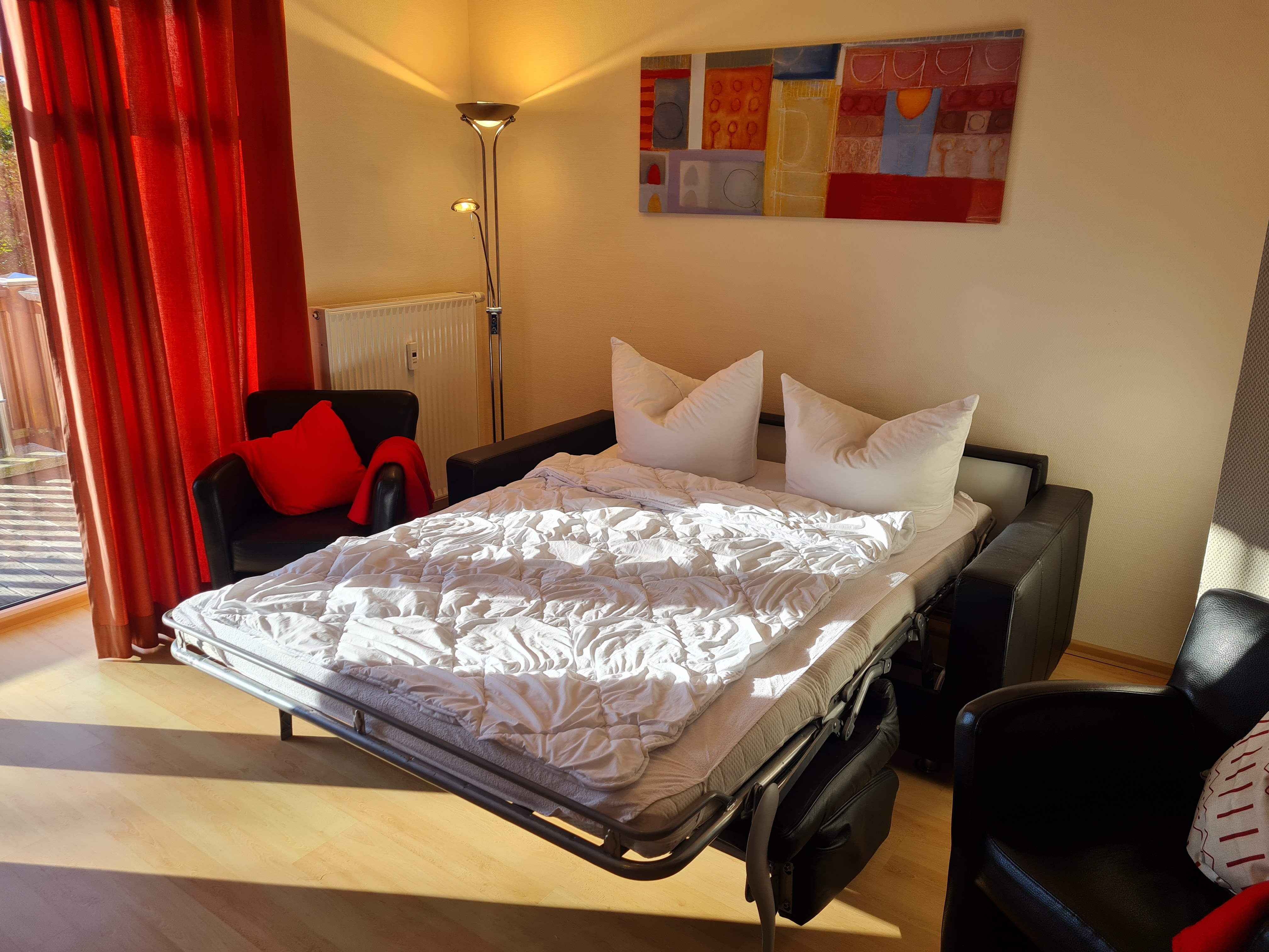 | Wohnzimmer: | Wohn- und Essbereich, Schlafcouch aus Leder 150x200cm mit Matratze, Flachbild-TV, Sideboard, 2 Sessel, Tisch, Radio mit CD und Bluetooth, Leselampe |